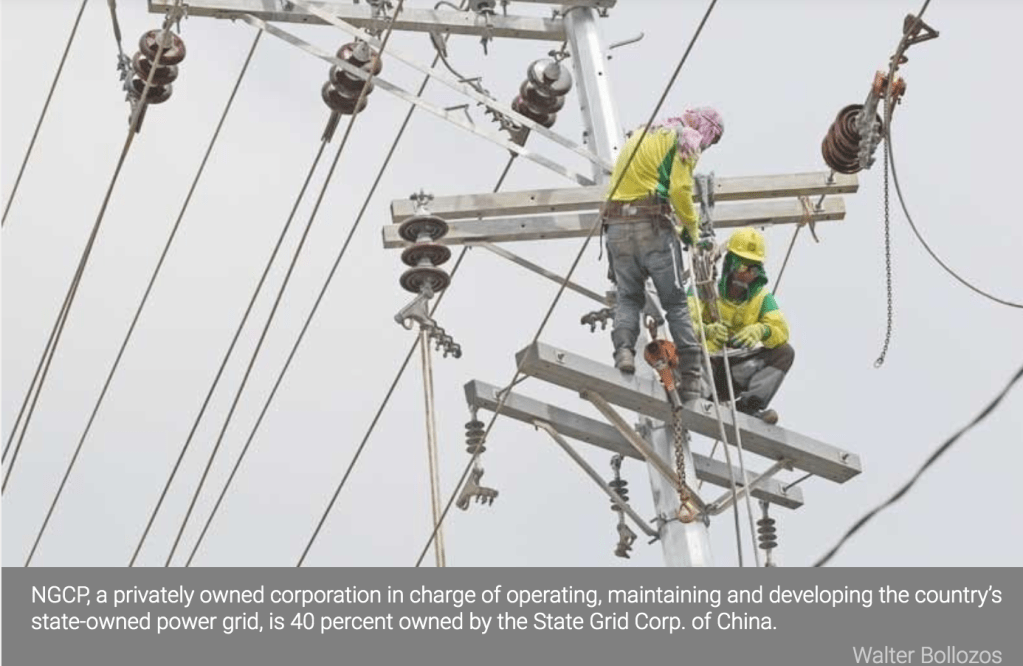 The private company in charge of operating, maintaining, and developing the Philippines ‘ state-owned power grid is reported to have 40% owned by the State Grid Corp. of China.