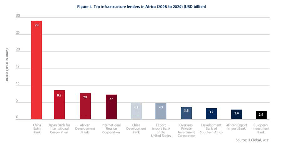 The report highlighted China’s outsized role in African infrastructure financing during the period of 2008 through 2020. Together, the China Exim Bank and the China Development Bank provided almost $34 billion in financing, three times as much as that of the next largest provider, the Japan Bank for International Cooperation.