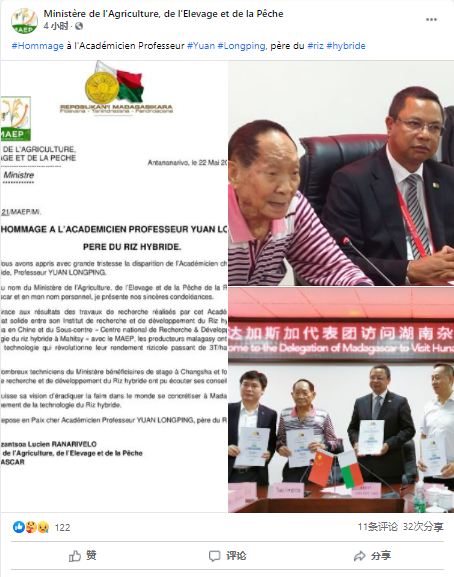 “We are saddened by the passing of Professor Yuan Longping, the father of hybrid rice and an academician of the Chinese Academy of Engineering. On behalf of the Ministry of Agriculture, Animal Husbandry and Fisheries of the Republic of Madagascar, and in my own name, I express my deep condolences. Thanks to the research results of this academician, and the solid cooperation between the “National Hybrid Rice Engineering Technology Research Center” in Changsha, China, the “National Hybrid Rice Engineering Technology Research Center Africa Sub-center” in Mayiqi, Madagascar, and the Ministry of Agriculture of Ma. Ma’s farmers benefit from the revolutionary technology of hybrid rice. The yield has increased from 3 tons/ha to 10 tons/ha. Many technicians from the Ministry of Agriculture have gone to Changsha Hybrid Rice Development Center for training and have listened to his teachings. I wish that through the development of hybrid rice technology, the dream of making the whole world have a full meal can be realized in Madagascar. May the beloved Academician and Professor Yuan Longping, the father of hybrid rice rest in peace.”