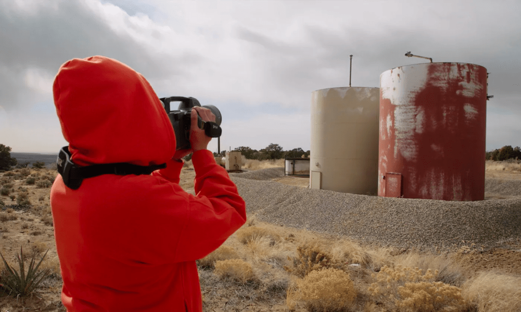 From behind her FLIR GF320 infrared camera, Kendra Pinto sees plumes of purple smoke otherwise invisible to the naked eye. They’re full of methane and volatile organic compounds, and they’re wafting out of an oil tank in New Mexico’s San Juan Basin.