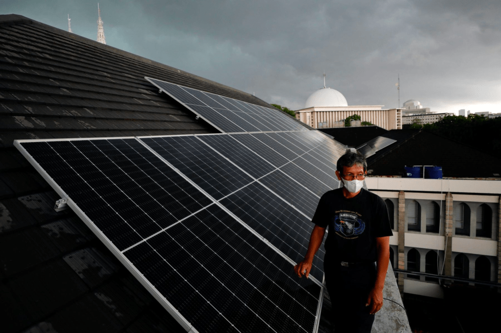 Solar panels on the roof of the Jakarta Cathedral, in Jakarta, Indonesia (Image: Willy Kurniawan / Alamy)