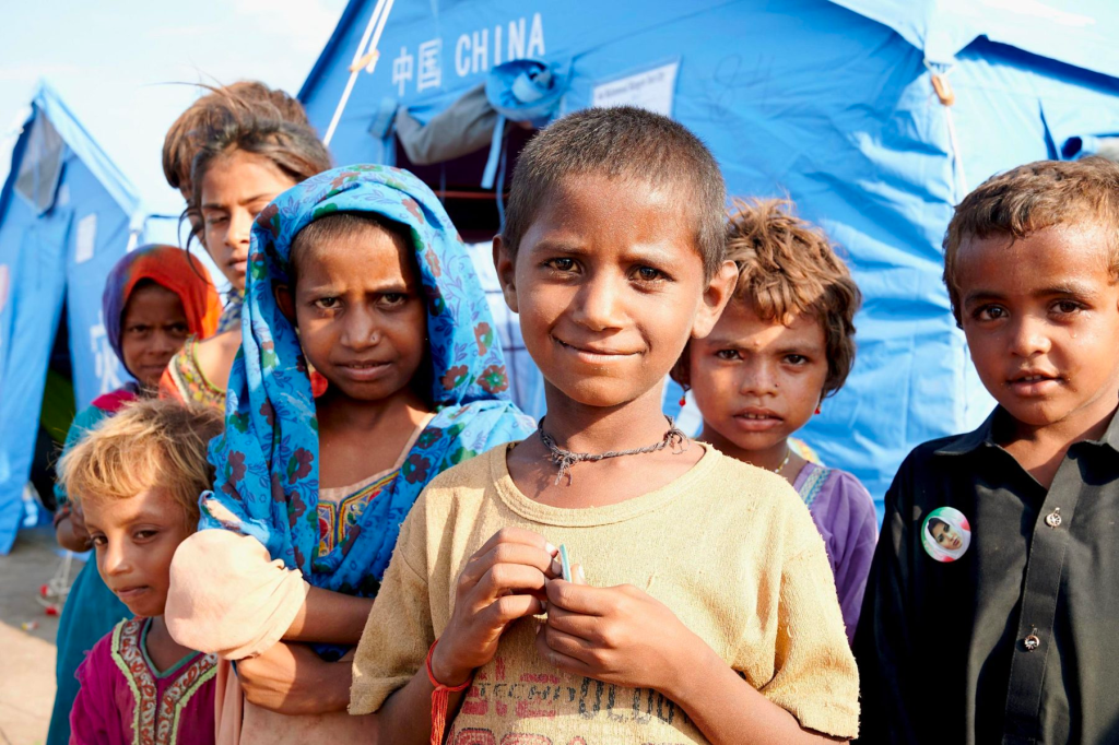 Flood-affected children at a makeshift shelter built with tents donated by China, in southern Pakistan’s Sindh province, September 2022 (Image: Tang Binhui / Alamy)